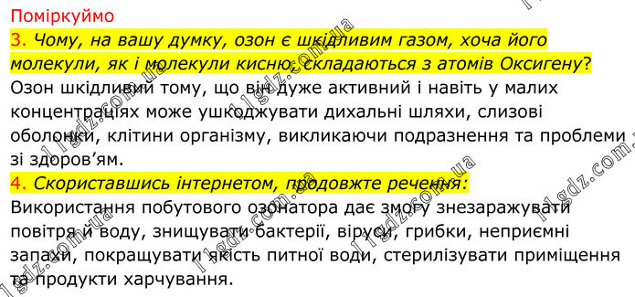 Поміркуймо 3. Чому, на вашу думку, озон є шкідливим газом, хоча його молекули, як і молекули кисню, складаються з атомів Оксигену? Озон шкідливий тому, що він дуже активний і навіть у малих концентраціях може ушкоджувати дихальні шляхи, слизові оболонки, клітини організму, викликаючи подразнення та проблеми зі здоров’ям. 4. Скориставшись інтернетом, продовжте речення: Використання побутового озонатора дає змогу знезаражувати повітря й воду, знищувати бактерії, віруси, грибки, неприємні запахи, покращувати якість питної води, стерилізувати приміщення та продукти харчування.