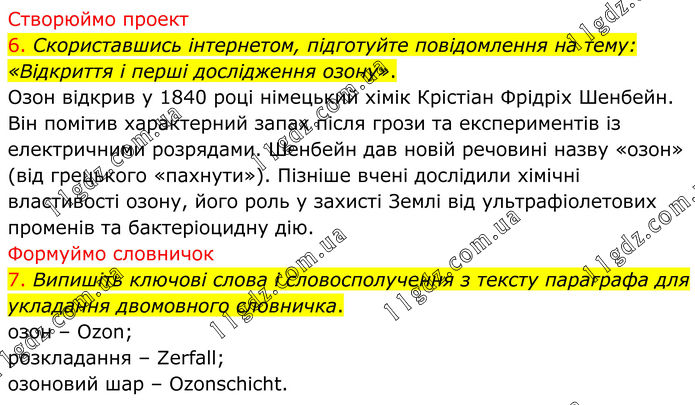 Створюймо проект 6. Скориставшись інтернетом, підготуйте повідомлення на тему: «Відкриття і перші дослідження озону». Озон відкрив у 1840 році німецький хімік Крістіан Фрідріх Шенбейн. Він помітив характерний запах після грози та експериментів із електричними розрядами. Шенбейн дав новій речовині назву «озон» (від грецького «пахнути»). Пізніше вчені дослідили хімічні властивості озону, його роль у захисті Землі від ультрафіолетових променів та бактеріоцидну дію. Формуймо словничок 7. Випишіть ключові слова і словосполучення з тексту параграфа для укладання двомовного словничка. озон – Ozon; розкладання – Zerfall; озоновий шар – Ozonschicht.