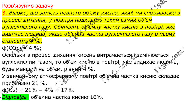 Розв'язуймо задачу 3. Відомо, що замість певного об’єму кисню, який ми споживаємо в процесі дихання, у повітря надходить такий самий об’єм вуглекислого газу. Обчисліть об’ємну частку кисню в повітрі, яке видихає людина, якщо об’ємна частка вуглекислого газу в ньому становить 4 %. ф(CO₂) = 4 %; Оскільки в процесі дихання кисень витрачається і замінюється вуглекислим газом, то об'єм кисню в повітрі, яке видихає людина, буде менший на об'єм, рівний 4 %. У звичайному атмосферному повітрі об’ємна частка кисню складає приблизно 21 %. ф(O₂) = 21% − 4% = 17%. Відповідь: об'ємна частка кисню 16%.