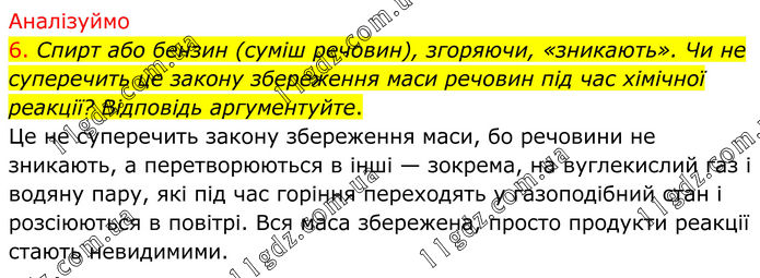 Аналізуймо 6. Спирт або бензин (суміш речовин), згоряючи, «зникають». Чи не суперечить це закону збереження маси речовин під час хімічної реакції? Відповідь аргументуйте. Це не суперечить закону збереження маси, бо речовини не зникають, а перетворюються в інші — зокрема, на вуглекислий газ і водяну пару, які під час горіння переходять у газоподібний стан і розсіюються в повітрі. Вся маса збережена, просто продукти реакції стають невидимими.