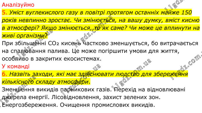 Аналізуймо 5. Уміст вуглекислого газу в повітрі протягом останніх майже 150 років невпинно зростає. Чи змінюється, на вашу думку, вміст кисню в атмосфері? Якщо змінюється, то як саме? Чи може це вплинути на живі організми? При збільшенні CO₂ кисень частково зменшується, бо витрачається на спалювання палива. Це може погіршити умови для життя, особливо в закритих екосистемах. У команді 6. Назвіть заходи, які має здійснювати людство для збереження кількісного складу атмосфери. Зменшення викидів парникових газів. Перехід на відновлювані джерела енергії. Лісовідновлення, захист зелених зон. Енергозбереження. Очищення промислових викидів.