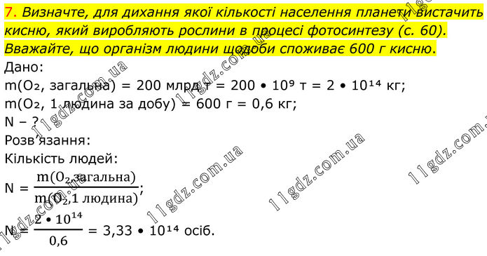 7. Визначте, для дихання якої кількості населення планети вистачить кисню, який виробляють рослини в процесі фотосинтезу (с. 60). Вважайте, що організм людини щодоби споживає 600 г кисню. Дано: m(О₂, загальна) = 200 млрд т = 200 • 10⁹ т = 2 • 10¹⁴ кг; m(О₂, 1 людина за добу) = 600 г = 0,6 кг; N – ? Розв’язання: Кількість людей: N = (m(О₂,загальна))/(m(О₂,1 людина)); N = (2 • 10¹⁴)/0,6 = 3,33 • 10¹⁴ осіб.