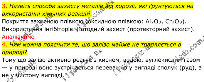 3. Назвіть способи захисту металів від корозії, які ґрунтуються на використанні хімічних реакцій. Покриття захисною плівкою (оксидною плівкою: Al₂O₃, Cr₂O₃). Використання інгібіторів. Катодний захист (протекторний захист). Аналізуймо 4. Чим можна пояснити те, що залізо майже не трапляється в природі? Тому що залізо активно реагує з киснем, водою, вуглекислим газом — у природі воно зустрічається переважно у вигляді сполук (руд), а не у чистому вигляді.