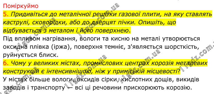 Поміркуймо 5. Придивіться до металічної решітки газової плити, на яку ставлять каструлі, сковорідки, або до дверцят пічки. Опишіть, що відбувається з металом і його поверхнею. Під впливом нагрівання, вологи та кисню на металі утворюється оксидна плівка (іржа), поверхня темніє, з'являється шорсткість, руйнується блиск. 6. Чому у великих містах, промислових центрах корозія металевих конструкцій є інтенсивнішою, ніж у приміській місцевості? У містах більше вологи, оксидів сірки, кислотних дощів, викидів заводів і транспорту — всі ці речовини прискорюють корозію.