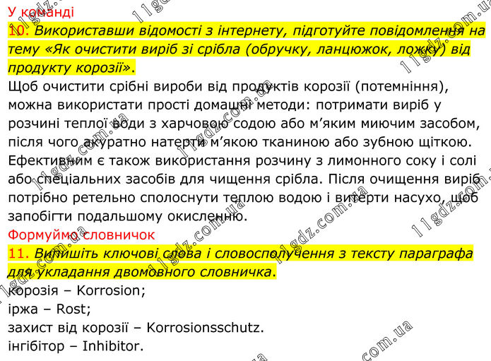 У команді 10. Використавши відомості з інтернету, підготуйте повідомлення на тему «Як очистити виріб зі срібла (обручку, ланцюжок, ложку) від продукту корозії». Щоб очистити срібні вироби від продуктів корозії (потемніння), можна використати прості домашні методи: потримати виріб у розчині теплої води з харчовою содою або м’яким миючим засобом, після чого акуратно натерти м’якою тканиною або зубною щіткою. Ефективним є також використання розчину з лимонного соку і солі або спеціальних засобів для чищення срібла. Після очищення виріб потрібно ретельно сполоснути теплою водою і витерти насухо, щоб запобігти подальшому окисленню. Формуймо словничок 11. Випишіть ключові слова і словосполучення з тексту параграфа для укладання двомовного словничка. корозія – Korrosion; іржа – Rost; захист від корозії – Korrosionsschutz. інгібітор – Inhibitor.