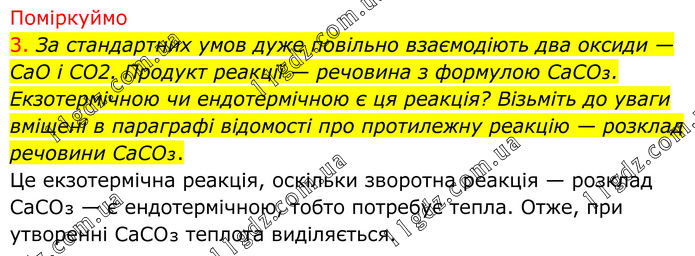 Поміркуймо 3. За стандартних умов дуже повільно взаємодіють два оксиди — CaO і CO2. Продукт реакції — речовина з формулою CaCO₃. Екзотермічною чи ендотермічною є ця реакція? Візьміть до уваги вміщені в параграфі відомості про протилежну реакцію — розклад речовини CaCO₃. Це екзотермічна реакція, оскільки зворотна реакція — розклад CaCO₃ — є ендотермічною, тобто потребує тепла. Отже, при утворенні CaCO₃ теплота виділяється.