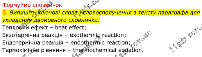 Формуймо словничок 6. Випишіть ключові слова і словосполучення з тексту параграфа для укладання двомовного словничка. Тепловий ефект – heat effect; Екзотермічна реакція – exothermic reaction; Ендотермічна реакція – endothermic reaction; Термохімічне рівняння – thermochemical equation.