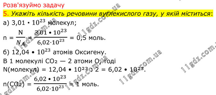 Розв'язуймо задачу 5. Укажіть кількість речовини вуглекислого газу, у якій міститься: а) 3,01 • 10^23 молекул; n = N/N_A = (3,01 • 10^23)/(6,02·10²³) = 0,5 моль. б) 12,04 • 10^23 атомів Оксигену. В 1 молекулі CO₂ — 2 атоми O, тоді N(молекул) = 12,04 • 10²³ : 2 = 6,02 • 10²³. n(CO₂) = (6,02 • 10^23)/(6,02·10²³) = 1 моль.