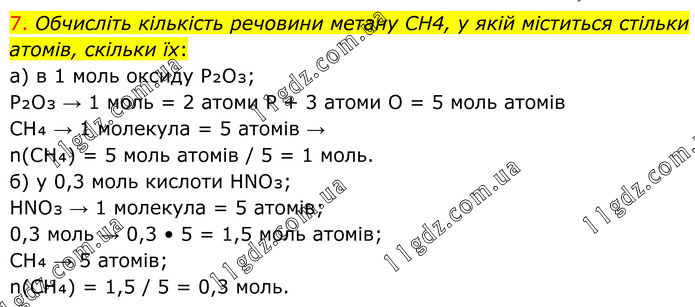 7. Обчисліть кількість речовини метану CH4, у якій міститься стільки атомів, скільки їх: а) в 1 моль оксиду P₂O₃; P₂O₃ → 1 моль = 2 атоми P + 3 атоми O = 5 моль атомів CH₄ → 1 молекула = 5 атомів → n(CH₄) = 5 моль атомів / 5 = 1 моль. б) у 0,3 моль кислоти HNO₃; HNO₃ → 1 молекула = 5 атомів; 0,3 моль → 0,3 • 5 = 1,5 моль атомів; CH₄ → 5 атомів; n(CH₄) = 1,5 / 5 = 0,3 моль.