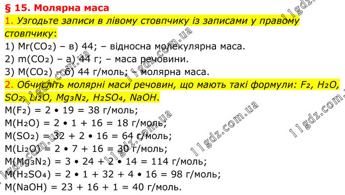 § 15. Молярна маса 1. Узгодьте записи в лівому стовпчику із записами у правому стовпчику: 1) Mr(CO₂) – в) 44; – відносна молекулярна маса. 2) m(CO₂) – а) 44 г; – маса речовини. 3) M(CO₂) – б) 44 г/моль; – молярна маса. 2. Обчисліть молярні маси речовин, що мають такі формули: F₂, H₂O, SO₂, Li₂O, Mg₃N₂, H₂SO₄, NaOH. M(F₂) = 2 • 19 = 38 г/моль; M(H₂O) = 2 • 1 + 16 = 18 г/моль; M(SO₂) = 32 + 2 • 16 = 64 г/моль; M(Li₂O) = 2 • 7 + 16 = 30 г/моль; M(Mg₃N₂) = 3 • 24 + 2 • 14 = 114 г/моль; M(H₂SO₄) = 2 • 1 + 32 + 4 • 16 = 98 г/моль; M(NaOH) = 23 + 16 + 1 = 40 г/моль.
