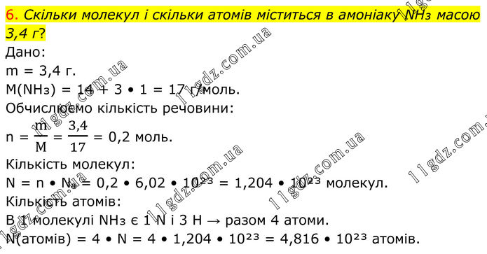6. Скільки молекул і скільки атомів міститься в амоніаку NH₃ масою 3,4 г? Дано: m = 3,4 г. M(NH₃) = 14 + 3 • 1 = 17 г/моль. Обчислюємо кількість речовини: n = m/М = 3,4/17 = 0,2 моль. Кількість молекул: N = n • Nₐ = 0,2 • 6,02 • 10²³ = 1,204 • 10²³ молекул. Кількість атомів: В 1 молекулі NH₃ є 1 N і 3 H → разом 4 атоми. N(атомів) = 4 • N = 4 • 1,204 • 10²³ = 4,816 • 10²³ атомів.