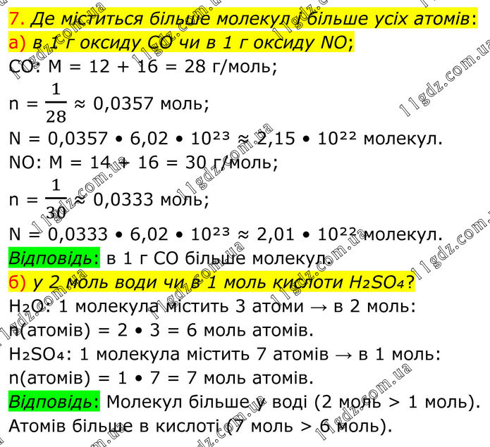 7. Де міститься більше молекул і більше усіх атомів: а) в 1 г оксиду CO чи в 1 г оксиду NO; CO: M = 12 + 16 = 28 г/моль; n = 1/28 ≈ 0,0357 моль; N = 0,0357 • 6,02 • 10²³ ≈ 2,15 • 10²² молекул. NO: M = 14 + 16 = 30 г/моль; n = 1/30 ≈ 0,0333 моль; N = 0,0333 • 6,02 • 10²³ ≈ 2,01 • 10²² молекул. Відповідь: в 1 г CO більше молекул. б) у 2 моль води чи в 1 моль кислоти H₂SO₄? H₂O: 1 молекула містить 3 атоми → в 2 моль: n(атомів) = 2 • 3 = 6 моль атомів. H₂SO₄: 1 молекула містить 7 атомів → в 1 моль: n(атомів) = 1 • 7 = 7 моль атомів. Відповідь: Молекул більше у воді (2 моль > 1 моль). Атомів більше в кислоті (7 моль > 6 моль).