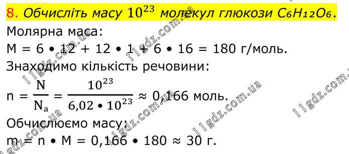 8. Обчисліть масу 10^23 молекул глюкози C₆H₁₂O₆. Молярна маса: M = 6 • 12 + 12 • 1 + 6 • 16 = 180 г/моль. Знаходимо кількість речовини: n = N/Nₐ = 10²³/(6,02 • 10²³) ≈ 0,166 моль. Обчислюємо масу: m = n • M = 0,166 • 180 ≈ 30 г.