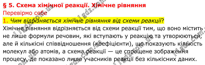 Перевірмо себе 1. Чим відрізняється хімічне рівняння від схеми реакції? Хімічне рівняння відрізняється від схеми реакції тим, що воно містить не лише формули речовин, які вступають у реакцію та утворюються, але й кількісні співвідношення (коефіцієнти), що показують кількість молекул або атомів, а схема реакції — це спрощене зображення процесу, де показано лише учасників реакції без кількісних даних.