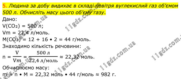5. Людина за добу видихає в складі повітря вуглекислий газ об’ємом 500 л. Обчисліть масу цього об’єму газу. Дано: V(CO₂) = 500 л; Vm = 22,4 л/моль. M(CO₂) = 12 + 16 • 2 = 44 г/моль. Знаходимо кількість речовини: n = V/Vm = (500 л)/(22,4 л/моль) ≈ 22,32 моль. Обчислюємо масу: m = n • M = 22,32 моль • 44 г/моль ≈ 982 г.