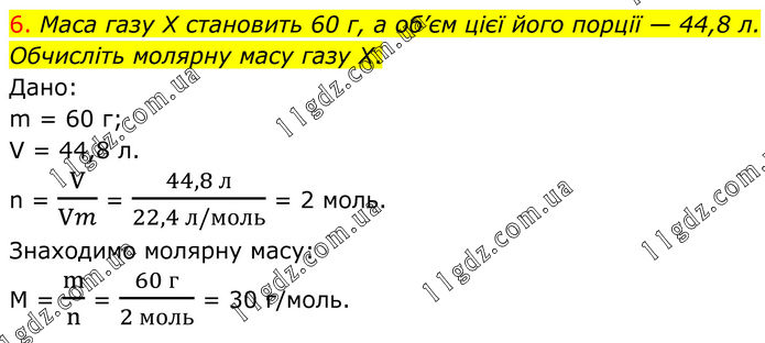 6. Маса газу X становить 60 г, а об’єм цієї його порції — 44,8 л. Обчисліть молярну масу газу X. Дано: m = 60 г; V = 44,8 л. n = V/Vm = (44,8 л)/(22,4 л/моль) = 2 моль. Знаходимо молярну масу: M = m/n = (60 г)/(2 моль) = 30 г/моль.