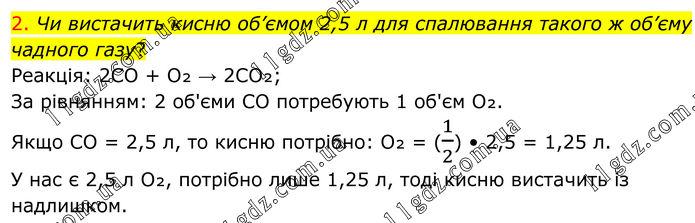 2. Чи вистачить кисню об’ємом 2,5 л для спалювання такого ж об’єму чадного газу? Реакція: 2CO + O₂ → 2CO₂; За рівнянням: 2 об'єми CO потребують 1 об'єм O₂. Якщо CO = 2,5 л, то кисню потрібно: O₂ = (1/2) • 2,5 = 1,25 л. У нас є 2,5 л O₂, потрібно лише 1,25 л, тоді кисню вистачить із надлишком.