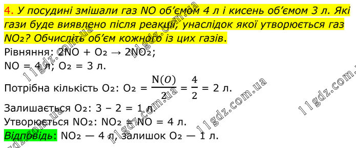4. У посудині змішали газ NO об’ємом 4 л і кисень об’ємом 3 л. Які гази буде виявлено після реакції, унаслідок якої утворюється газ NO₂? Обчисліть об’єм кожного із цих газів. Рівняння: 2NO + O₂ → 2NO₂; NO = 4 л; O₂ = 3 л. Потрібна кількість O₂: O₂ = (N(O))/2 = 4/2 = 2 л. Залишається O₂: 3 – 2 = 1 л. Утворюється NO₂: NO₂ = NO = 4 л. Відповідь: NO₂ — 4 л, залишок O₂ — 1 л.