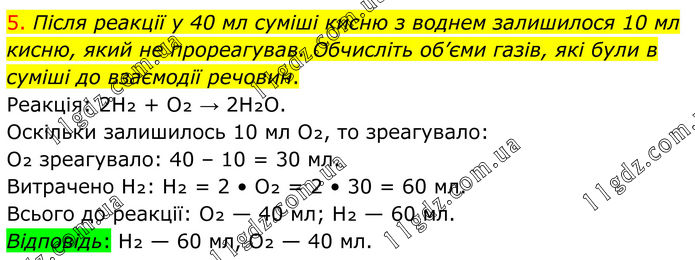 5. Після реакції у 40 мл суміші кисню з воднем залишилося 10 мл кисню, який не прореагував. Обчисліть об’єми газів, які були в суміші до взаємодії речовин. Реакція: 2H₂ + O₂ → 2H₂O. Оскільки залишилось 10 мл O₂, то зреагувало: O₂ зреагувало: 40 – 10 = 30 мл. Витрачено H₂: H₂ = 2 • O₂ = 2 • 30 = 60 мл. Всього до реакції: O₂ — 40 мл; H₂ — 60 мл. Відповідь: H₂ — 60 мл, O₂ — 40 мл.