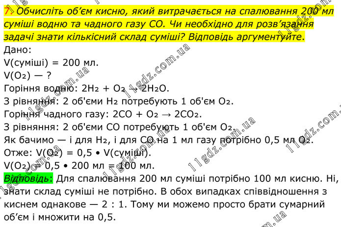 7. Обчисліть об’єм кисню, який витрачається на спалювання 200 мл суміші водню та чадного газу CO. Чи необхідно для розв’язання задачі знати кількісний склад суміші? Відповідь аргументуйте. Дано: V(суміші) = 200 мл. V(O₂) — ? Горіння водню: 2H₂ + O₂ → 2H₂O. З рівняння: 2 об'єми H₂ потребують 1 об'єм O₂. Горіння чадного газу: 2CO + O₂ → 2CO₂. З рівняння: 2 об'єми CO потребують 1 об'єм O₂. Як бачимо — і для H₂, і для CO на 1 мл газу потрібно 0,5 мл O₂. Отже: V(O₂) = 0,5 • V(суміші). V(O₂) = 0,5 • 200 мл = 100 мл. Відповідь: Для спалювання 200 мл суміші потрібно 100 мл кисню. Ні, знати склад суміші не потрібно. В обох випадках співвідношення з киснем однакове — 2 : 1. Тому ми можемо просто брати сумарний об’єм і множити на 0,5.