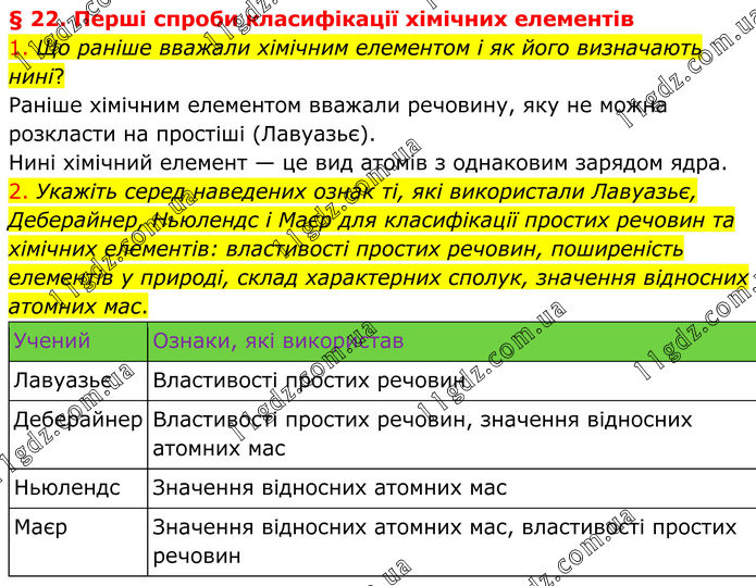 § 22. Перші спроби класифікації хімічних елементів 1. Що раніше вважали хімічним елементом і як його визначають нині? Раніше хімічним елементом вважали речовину, яку не можна розкласти на простіші (Лавуазьє). Нині хімічний елемент — це вид атомів з однаковим зарядом ядра. 2. Укажіть серед наведених ознак ті, які використали Лавуазьє, Деберайнер, Ньюлендс і Маєр для класифікації простих речовин та хімічних елементів: властивості простих речовин, поширеність елементів у природі, склад характерних сполук, значення відносних атомних мас. Учений Ознаки, які використав Лавуазьє Властивості простих речовин. Деберайнер Властивості простих речовин, значення відносних атомних мас. Ньюлендс Значення відносних атомних мас. Маєр Значення відносних атомних мас, властивості простих речовин.