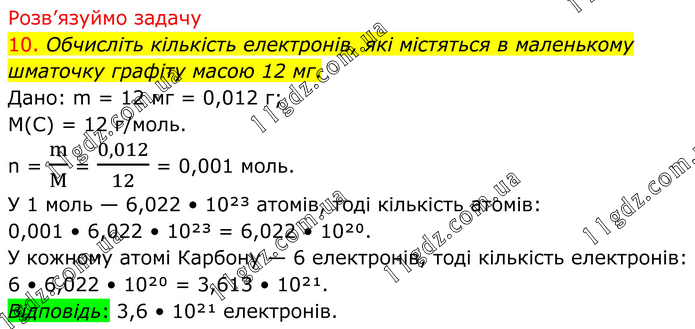 Розв’язуймо задачу 10. Обчисліть кількість електронів, які містяться в маленькому шматочку графіту масою 12 мг. Дано: m = 12 мг = 0,012 г; M(C) = 12 г/моль. n = m/M = 0,012/12 = 0,001 моль. У 1 моль — 6,022 • 10²³ атомів, тоді кількість атомів: 0,001 • 6,022 • 10²³ = 6,022 • 10²⁰. У кожному атомі Карбону — 6 електронів, тоді кількість електронів: 6 • 6,022 • 10²⁰ = 3,613 • 10²¹. Відповідь: 3,6 • 10²¹ електронів.