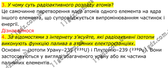3. У чому суть радіоактивного розпаду атомів? Це самочинне перетворення ядер атомів одного елемента на ядра іншого елемента, що супроводжується випромінюванням частинок і енергії. Дізнаваймося 4. За відомостями з інтернету з’ясуйте, які радіоактивні ізотопи виконують функцію палива в атомних електростанціях. Основні — ізотопи Урану–235 (²³⁵U) і Плутонію–239 (²³⁹Pu). Вони застосовуються у вигляді збагаченого урану або як частина паливних елементів.