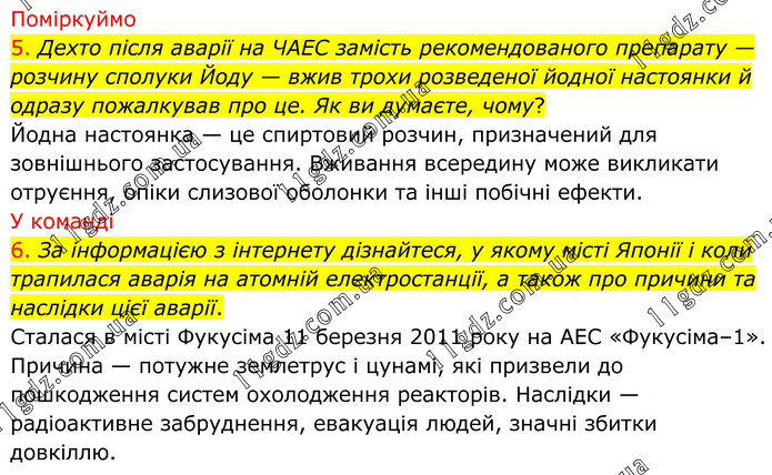 Поміркуймо 5. Дехто після аварії на ЧАЕС замість рекомендованого препарату — розчину сполуки Йоду — вжив трохи розведеної йодної настоянки й одразу пожалкував про це. Як ви думаєте, чому? Йодна настоянка — це спиртовий розчин, призначений для зовнішнього застосування. Вживання всередину може викликати отруєння, опіки слизової оболонки та інші побічні ефекти. У команді 6. За інформацією з інтернету дізнайтеся, у якому місті Японії і коли трапилася аварія на атомній електростанції, а також про причини та наслідки цієї аварії. Сталася в місті Фукусіма 11 березня 2011 року на АЕС «Фукусіма–1». Причина — потужне землетрус і цунамі, які призвели до пошкодження систем охолодження реакторів. Наслідки — радіоактивне забруднення, евакуація людей, значні збитки довкіллю.