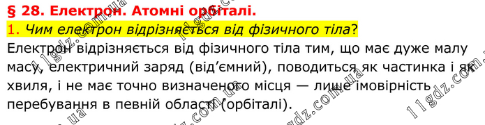 § 28. Електрон. Атомні орбіталі. 1. Чим електрон відрізняється від фізичного тіла? Електрон відрізняється від фізичного тіла тим, що має дуже малу масу, електричний заряд (від’ємний), поводиться як частинка і як хвиля, і не має точно визначеного місця — лише імовірність перебування в певній області (орбіталі).