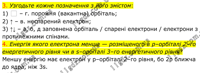 3. Узгодьте кожне позначення з його змістом: 1) ⬜ – г. порожня (вакантна) орбіталь; 2) ↑ – в. неспарений електрон; 3) ↑↓ – а, б, д заповнена орбіталь / спарені електрони / електрони з протилежними спінами. 4. Енергія якого електрона менша — розміщеного в р–орбіталі 2–го енергетичного рівня чи в s–орбіталі 3–го енергетичного рівня? Меншу енергію має електрон у p–орбіталі 2–го рівня, бо 2p ближча до ядра, ніж 3s.