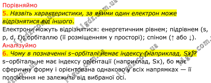 Порівняймо 5. Назвіть характеристики, за якими один електрон може відрізнятися від іншого. Електрони можуть відрізнятися: енергетичним рівнем; підрівнем (s, p, d, f); орбіталлю (її розміщенням у просторі); спіном (↑ або ↓). Аналізуймо 6. Чому в позначенні s–орбіталі немає індексу (наприклад, Sх)? s–орбіталь не має індексу орієнтації (наприклад, Sx), бо має сферичну форму і орієнтована однаково у всіх напрямках — її положення не залежить від вибраної осі.