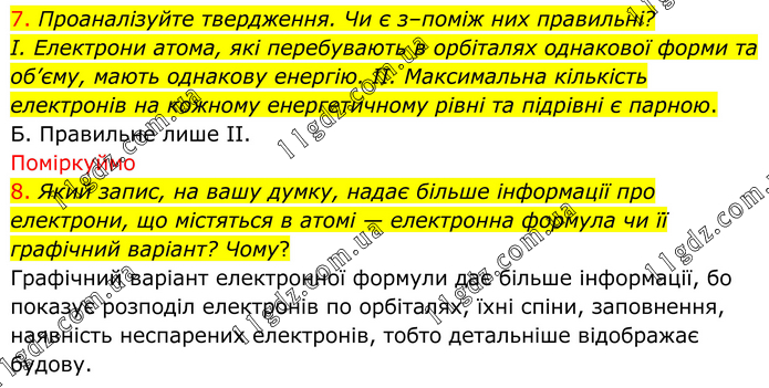 7. Проаналізуйте твердження. Чи є з–поміж них правильні? І. Електрони атома, які перебувають в орбіталях однакової форми та об’єму, мають однакову енергію. II. Максимальна кількість електронів на кожному енергетичному рівні та підрівні є парною. Б. Правильне лише II. Поміркуймо 8. Який запис, на вашу думку, надає більше інформації про електрони, що містяться в атомі — електронна формула чи її графічний варіант? Чому? Графічний варіант електронної формули дає більше інформації, бо показує розподіл електронів по орбіталях, їхні спіни, заповнення, наявність неспарених електронів, тобто детальніше відображає будову.