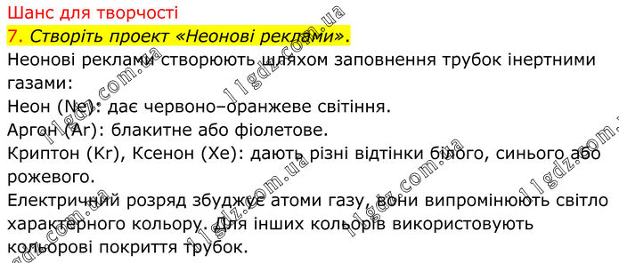 Шанс для творчості 7. Створіть проект «Неонові реклами». Неонові реклами створюють шляхом заповнення трубок інертними газами: Неон (Ne): дає червоно–оранжеве світіння. Аргон (Ar): блакитне або фіолетове. Криптон (Kr), Ксенон (Xe): дають різні відтінки білого, синього або рожевого. Електричний розряд збуджує атоми газу, вони випромінюють світло характерного кольору. Для інших кольорів використовують кольорові покриття трубок.