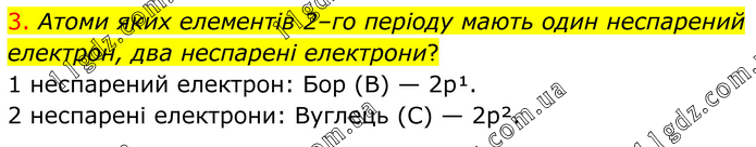 3. Атоми яких елементів 2–го періоду мають один неспарений електрон, два неспарені електрони? 1 неспарений електрон: Бор (B) — 2p¹. 2 неспарені електрони: Вуглець (C) — 2p².