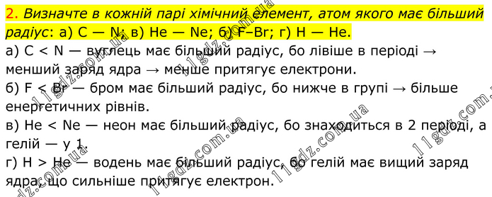 2. Визначте в кожній парі хімічний елемент, атом якого має більший радіус: а) C — N; в) He — Ne; б) F–Br; г) Н — He. а) C < N — вуглець має більший радіус, бо лівіше в періоді → менший заряд ядра → менше притягує електрони. б) F < Br — бром має більший радіус, бо нижче в групі → більше енергетичних рівнів. в) He < Ne — неон має більший радіус, бо знаходиться в 2 періоді, а гелій — у 1. г) H > He — водень має більший радіус, бо гелій має вищий заряд ядра, що сильніше притягує електрон.