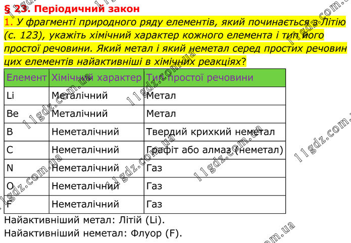 § 23. Періодичний закон 1. У фрагменті природного ряду елементів, який починається з Літію (с. 123), укажіть хімічний характер кожного елемента і тип його простої речовини. Який метал і який неметал серед простих речовин цих елементів найактивніші в хімічних реакціях? Елемент Хімічний характер Тип простої речовини Li Металічний Метал Be Металічний Метал B Неметалічний Твердий крихкий неметал C Неметалічний Графіт або алмаз (неметал) N Неметалічний Газ O Неметалічний Газ F Неметалічний Газ Найактивніший метал: Літій (Li). Найактивніший неметал: Флуор (F).