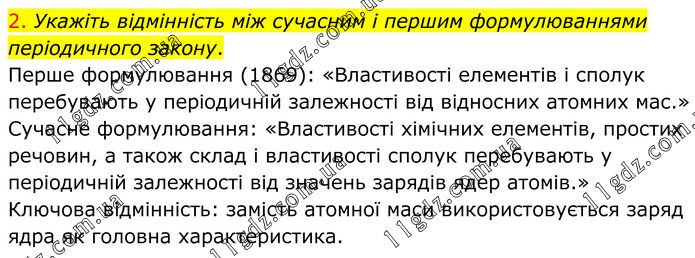 2. Укажіть відмінність між сучасним і першим формулюваннями періодичного закону. Перше формулювання (1869): «Властивості елементів і сполук перебувають у періодичній залежності від відносних атомних мас.» Сучасне формулювання: «Властивості хімічних елементів, простих речовин, а також склад і властивості сполук перебувають у періодичній залежності від значень зарядів ядер атомів.» Ключова відмінність: замість атомної маси використовується заряд ядра як головна характеристика.