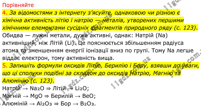 Порівняйте 4. За відомостями з інтернету з’ясуйте, однаковою чи різною є хімічна активність літію і натрію — металів, утворених першими хімічними елементами сусідніх фрагментів природного ряду (с. 123). Обидва — лужні метали, дуже активні, однак: Натрій (Na) активніший, ніж Літій (Li). Це пояснюється збільшенням радіуса атома та зменшенням енергії іонізації вниз по групі. Тому Na легше віддає електрон, тому активність вища. 5. Запишіть формули оксидів Літію, Берилію і Бору, взявши до уваги, що ці сполуки подібні за складом до оксидів Натрію, Магнію та Алюмінію (с. 123). Натрій → Na₂O ⇒ Літій → Li₂O; Магній → MgO ⇒ Берилій → BeO; Алюміній → Al₂O₃ ⇒ Бор → B₂O₃.