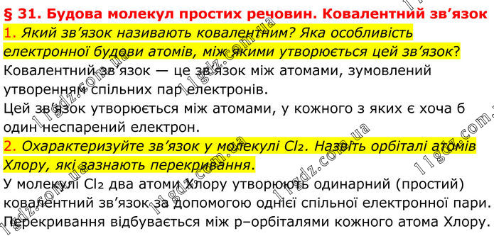 § 31. Будова молекул простих речовин. Ковалентний зв’язок 1. Який зв’язок називають ковалентним? Яка особливість електронної будови атомів, між якими утворюється цей зв’язок? Ковалентний зв’язок — це зв’язок між атомами, зумовлений утворенням спільних пар електронів. Цей зв’язок утворюється між атомами, у кожного з яких є хоча б один неспарений електрон. 2. Охарактеризуйте зв’язок у молекулі Cl₂. Назвіть орбіталі атомів Хлору, які зазнають перекривання. У молекулі Cl₂ два атоми Хлору утворюють одинарний (простий) ковалентний зв’язок за допомогою однієї спільної електронної пари. Перекривання відбувається між p–орбіталями кожного атома Хлору.