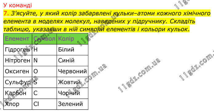 У команді 7. З’ясуйте, у який колір забарвлені кульки–атоми кожного хімічного елемента в моделях молекул, наведених у підручнику. Складіть таблицю, указавши в ній символи елементів і кольори кульок.