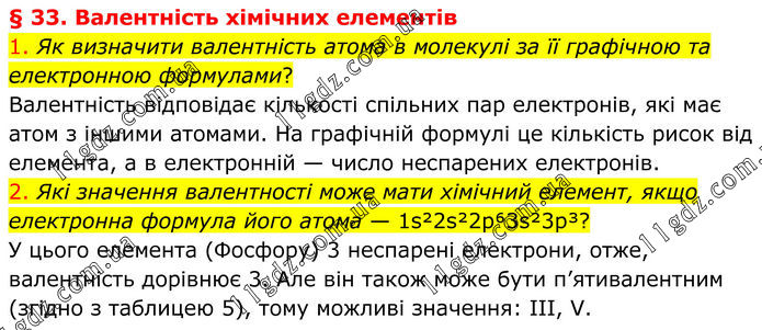 § 33. Валентність хімічних елементів 1. Як визначити валентність атома в молекулі за її графічною та електронною формулами? Валентність відповідає кількості спільних пар електронів, які має атом з іншими атомами. На графічній формулі це кількість рисок від елемента, а в електронній — число неспарених електронів. 2. Які значення валентності може мати хімічний елемент, якщо електронна формула його атома — 1s²2s²2p⁶3s²3p³? У цього елемента (Фосфору) 3 неспарені електрони, отже, валентність дорівнює 3. Але він також може бути п’ятивалентним (згідно з таблицею 5), тому можливі значення: III, V.