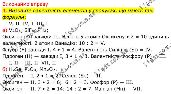 Виконаймо вправу 4. Визначте валентність елементів у сполуках, що мають такі формули: V, II IV, І ІІІ, І а) V₂O₅, SiF₄, PH₃; Oксиген (O) завжди II,. Всього 5 атомів Оксигену • 2 = 10 одиниць валентності. 2 атоми Ванадію: 10 : 2 = V. Флуор (F) завжди I, 4 • 1 = 4. Валентність Силіцію (Si) = IV. Гідроген (H) — завжди I, 3 • 1 = 3. Валентність Фосфору (P) = III. І, ІІ ІІІ, ІІ VII, ІІ б) H₂Se, P₂O₃, Mn₂O₇. Гідроген — I, 2 • 1 = 2. Селен (Se) — II. Оксиген — II, 3 • 2 = 6; 6 : 2 = 3. Фосфор (P) — III. Оксиген — II, 7 • 2 = 14; 14 : 2 = 7. Манган (Mn) — VII.