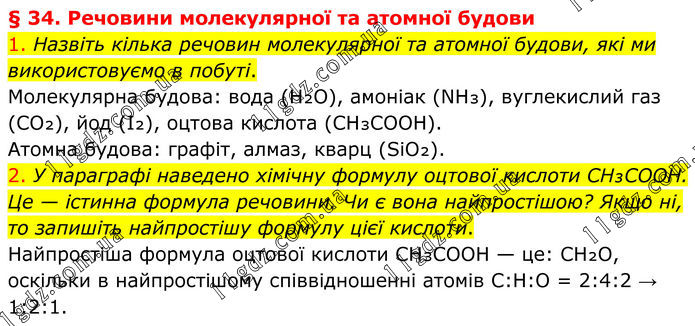 § 34. Речовини молекулярної та атомної будови 1. Назвіть кілька речовин молекулярної та атомної будови, які ми використовуємо в побуті. Молекулярна будова: вода (H₂O), амоніак (NH₃), вуглекислий газ (CO₂), йод (I₂), оцтова кислота (CH₃COOH). Атомна будова: графіт, алмаз, кварц (SiO₂). 2. У параграфі наведено хімічну формулу оцтової кислоти CH₃COOH. Це — істинна формула речовини. Чи є вона найпростішою? Якщо ні, то запишіть найпростішу формулу цієї кислоти. Найпростіша формула оцтової кислоти CH₃COOH — це: CH₂O, оскільки в найпростішому співвідношенні атомів C:H:O = 2:4:2 → 1:2:1.