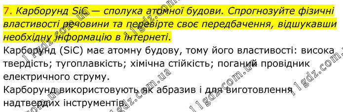 7. Карборунд SiC — сполука атомної будови. Спрогнозуйте фізичні властивості речовини та перевірте своє передбачення, відшукавши необхідну інформацію в інтернеті. Карборунд (SiC) має атомну будову, тому його властивості: висока твердість; тугоплавкість; хімічна стійкість; поганий провідник електричного струму. Карборунд використовують як абразив і для виготовлення надтвердих інструментів.