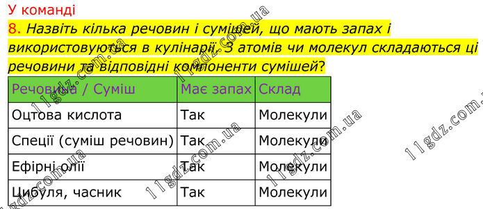 У команді 8. Назвіть кілька речовин і сумішей, що мають запах і використовуються в кулінарії. З атомів чи молекул складаються ці речовини та відповідні компоненти сумішей?