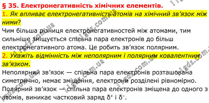 § 35. Електронегативність хімічних елементів. 1. Як впливає електронегативність атомів на хімічний зв’язок між ними? Чим більша різниця електронегативностей між атомами, тим сильніше зміщується спільна пара електронів до більш електронегативного атома. Це робить зв’язок полярним. 2. Укажіть відмінність між неполярним і полярним ковалентним зв’язком. Неполярний зв’язок — спільна пара електронів розташована симетрично, немає зміщення, електрони розділені рівномірно. Полярний зв’язок — спільна пара електронів зміщена до одного з атомів, виникає частковий заряд δ⁺ і δ⁻.