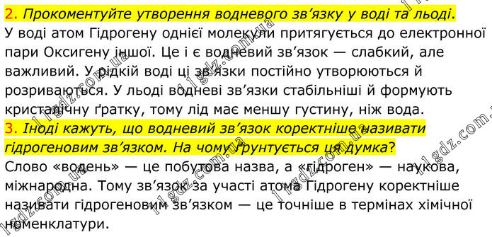 2. Прокоментуйте утворення водневого зв’язку у воді та льоді. У воді атом Гідрогену однієї молекули притягується до електронної пари Оксигену іншої. Це і є водневий зв’язок — слабкий, але важливий. У рідкій воді ці зв’язки постійно утворюються й розриваються. У льоді водневі зв’язки стабільніші й формують кристалічну ґратку, тому лід має меншу густину, ніж вода. 3. Іноді кажуть, що водневий зв’язок коректніше називати гідрогеновим зв’язком. На чому ґрунтується ця думка? Слово «водень» — це побутова назва, а «гідроген» — наукова, міжнародна. Тому зв’язок за участі атома Гідрогену коректніше називати гідрогеновим зв’язком — це точніше в термінах хімічної номенклатури.