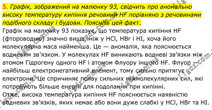 5. Графік, зображений на малюнку 93, свідчить про аномально високу температуру кипіння речовини HF порівняно з речовинами подібного складу і будови. Поясніть цей факт. Графік на малюнку 93 показує, що температура кипіння HF (фтороводню) значно вища, ніж у HCl, HBr і HI, хоча його молекулярна маса найменша. Це — аномалія, яка пояснюється водневим зв’язком. У молекулах HF виникають водневі зв’язки між атомом Гідрогену одного HF і атомом Флуору іншого HF. Флуор — найбільш електронегативний елемент, тому сильно притягує електрони. Це спричиняє появу сильних міжмолекулярних сил, які потребують більше енергії для подолання при кипінні. Отже, висока температура кипіння HF пояснюється наявністю водневих зв’язків, яких немає або вони дуже слабкі у HCl, HBr та HI.