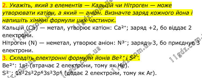 2. Укажіть, який з елементів — Кальцій чи Нітроген — може утворювати катіон, а який — аніон. Визначте заряд кожного йона і напишіть хімічні формули цих частинок. Кальцій (Ca) — метал, утворює катіон: Ca²⁺; заряд +2, бо віддає 2 електрони. Нітроген (N) — неметал, утворює аніон: N³⁻; заряд –3, бо приєднує 3 електрони. 3. Складіть електронні формули йонів Be²⁺ і S²⁻. Be²⁺: 1s² (втрачає 2 електрони, тому як He). S²⁻: 1s²2s²2p⁶3s²3p⁶ (додає 2 електрони, тому як Ar).