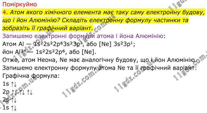 Поміркуймо 4. Атом якого хімічного елемента має таку саму електронну будову, що і йон Алюмінію? Складіть електронну формулу частинки та зобразіть її графічний варіант. Запишемо електронні формули атома і йона Алюмінію: Атом Аl — 1s²2s²2p⁶3s²3р1, або [Nе] 3s²3р1; йон Al³⁺ — 1s²2s²2p⁶, або [Nе]. Отже, атом Неона, Nе має аналогічну будову, що і йон Алюмінію. Запишемо електронну формулу атома Nе та її графічний варіант: Графічна формула: 1s ↑↓ 2p ↑↓ ↑↓ ↑↓ 2s ↑↓ 1s ↑↓